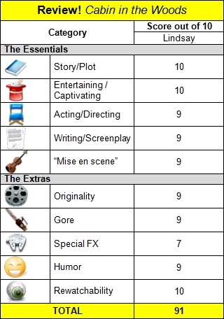 My thoughts are running out on vauge praises for the film and steering into Spoilerville. I really don’t want to go there but can promise a fun ride to anyone deciding to see the film. The direction, writing, level of captivation and even the acting for the most part are all operating on the highest level. If you’re a genre fanboy/girl or you are just looking for something remakably fresh, don’t miss what I’m already referring to as this decade’s Scream. I know I’m seeing it again with the rest of the FTS crew the first chance I get.