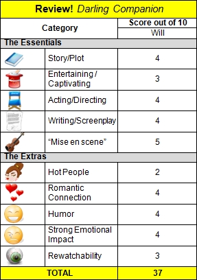 Diane Keaton and Kevin Kline are two actors certainly worthy of praise. They have chemistry and to an outside observer, they would make a perfect on screen couple. Darling Companion gives that a shot, it just doesn’t do it very well. In fact, Darling Companion doesn’t do much of anything well. This movie tries to be a romance, a comedy, and a drama but fails miserably at every one of those. This movie almost reminds me of The Big Year. The premise is Diane Keaton finds a dog by the side of the road and takes it to a vet. Keaton’s daughter falls in love with the vet and they are to be married. During the wedding festivities this dog goes missing and the family unites to track it down. Oh, and they have a psychic helping them.