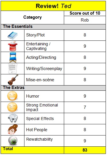 The story was full and well written. There was a lot of depth added to the plot and to the characters. There was more conflict than I was expecting as well, which ended in a nice Hollywood-style finish. I think that was the aim of the movie, though. The movie is set up to mirror family films but with the twist of adding a pot addicted teddy bear. Mark Wahlberg is perfect for comedies and he shows some more range in this film than usual. Mila Kunis also did a great job. There were times that she employed more acting prowess than was needed, but it helped make the movie feel like a more serious venture.