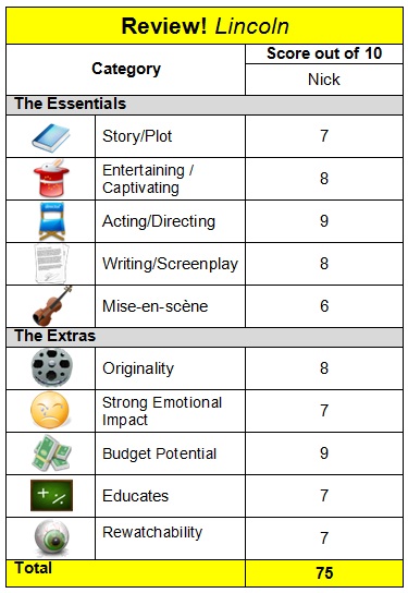 That being said, it’s still a solid film with great acting and a look and feel that really captures the moment. The score, feels recycled, but it still adds to the moments when Lincoln speaks or those tense moments of piecing the votes together. At over two hours, Lincoln is a film many will enjoy and few will consider a masterpiece.