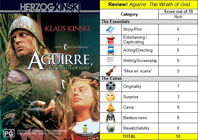 Aquirre: The Wrath of God  (1972) Directed by Werner Herzog. Starring: Klaus Kinski, Ruy Guerra and Helena Rojo. IMDB says: “In the 16th century, the ruthless and insane Aguirre leads a Spanish expedition in search of El Dorado.”