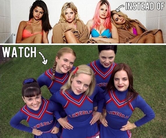 Now, I have never seen this movie, but the plots of these two feel related. Spring Breakers is about these girls on spring break who get arrested, then sprung out of jail by a drugs and guns dealer. He then enlists their help and they live a life of crime (or so suggest the synopsis and trailer on IMDB). Sugar and Spice is about a cheerleader who gets pregnant and finds herself living a life of crime to support her child and lifestyle. Either way, both movies have young girls (most likely in cheerleading outfits and/or bikinis) robbing banks and living the age old Cyndi Lauper adage: “Girls, they want to have fun… oh girls just want to have fun.”