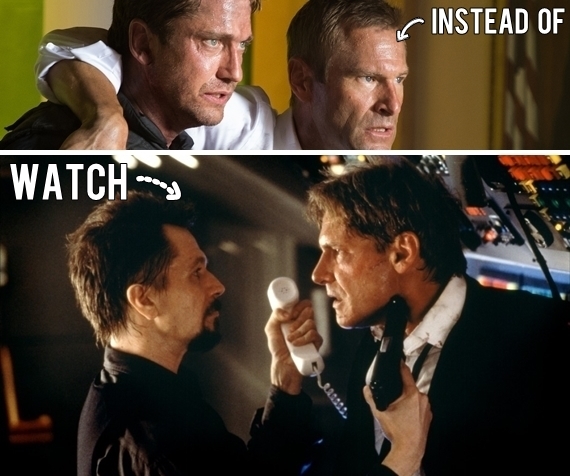 Rather than watch Antoine Fuqua direct Gerard Butler in a film where he’ll talk out the side of his mouth (and hopefully Spartan kicks a terrorist) watch the President (Harrison Ford) defend himself as he throws terrorists off his plane!