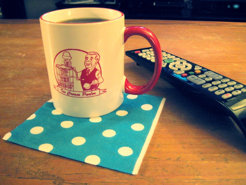 Today I enjoyed my first cup of joe since contamination. The mug is from a local ice cream shop called By the Scoop. They had mugs on display to buy for only $4 (a steal!) so I snatched one. The girl behind the counter was shocked and said I was the first person to ever buy one. Glad I could help.
