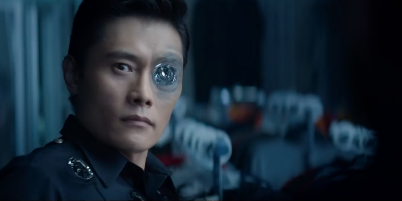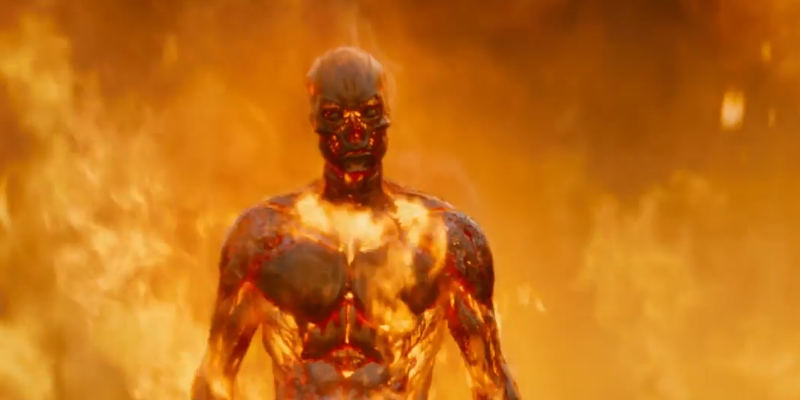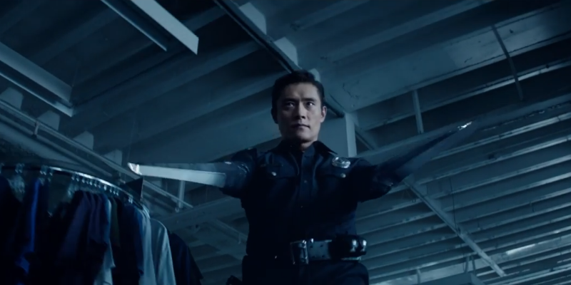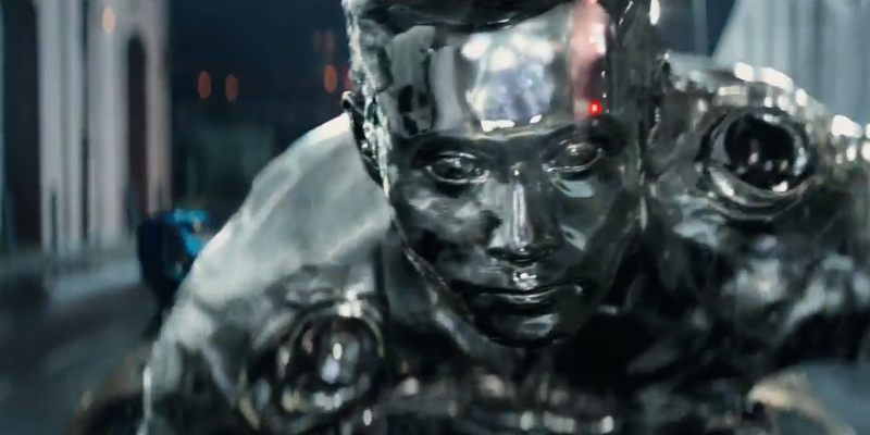 And here’s where I start to get concerned that instead of seeing a new Terminator movie, what we’re actually being given is a greatest hits montage of the previous four. As much as I loved the T-1000 from T2, I need something new. Making him Asian does not count as new. Nor does putting him in front of a mirror, that just makes more work for the animators for presumably no reason whatsoever.